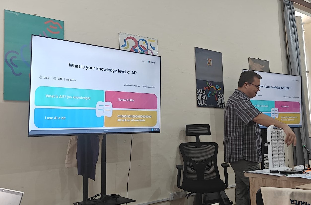 Kun esittelyt ja tulkkaukset olivat saatu hoidettua kuntoon, Nikolaus kävi lyhyesti läpi tekoälyn historiaa ja muuta taustoittavaa tietoa meille pohjustukseksi. Lisäksi hän järjesti pienen kyselyn, jolla selvitettiin miten paljon kukin oli jo tutustunut tekoälyyn omassa työssään. Hauskinta tässä kyselyssä oli ehdottomasti kyselyn toteuttamistapa. Saimme käsiimme ikään kuin peliohjaimet ja kyselyn kysymykset tulivat luokan eteen taululle. Siitä sitten saimme ohjaimesta väriä valitsemalla valita sopivimman vaihtoehdon annetuista vaihtoehdoista.