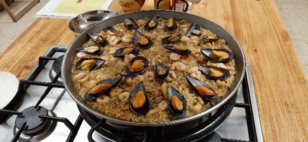 Ruoanlaittokurssilla, jolla ryhmämme kansainvälisyyttä täydensi vielä amerikkalainen pariskunta, nautimme yhdessä tyytyväisinä valmistamamme ateriaa parin tunnin puuhailun jälkeen. Opettajamme mainitsema espanjalainen myönteinen hedonismi, ystävällinen asennoituminen toisiin tuntemattomiin ihmisiin ja tahto elää tässä päivässä ja nauttia siitä tässä ja nyt, ”koska huomenna voi kuolema kohdata”, sai meidät hiljaisen kiitollisiksi pyöreän pöydän ääressä. Luonnollisesti ruoanlaitto opetti lisää ruoanlaittosanastoa ja ruokakulttuuria.