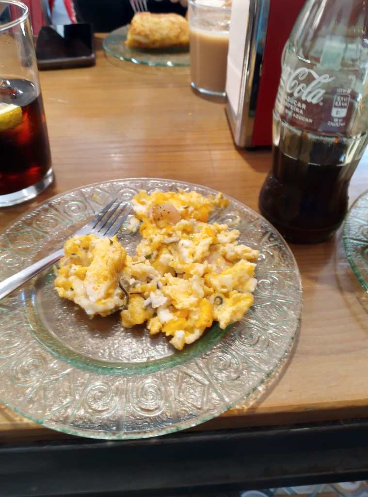 Tauolla hiukopalaa kulman kuppilasta. Lautasella tällä kertaa äyriäismunakasta.