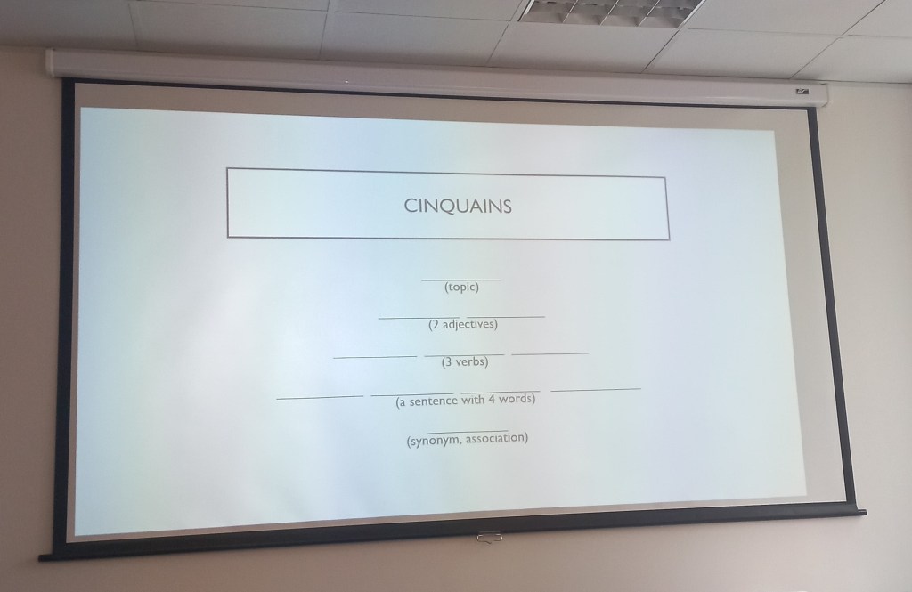Iltapäivällä lämpimimpään aikaan oli lounastauko. Lämpöasteita oli lähemmäs 30. Lounaan jälkeen oli vuorossa atelier eli työpaja vaihtelevasta teemasta. Ennakkotehtävämme oli ollut opetella ulkoa englanninkielinen runo. Usein iltapäivän työskentely liittyi tekstin luovaan käyttämiseen. Teimme myös kuunteluun liittyviä pariharjoituksia ulkona silmät sidottuina.